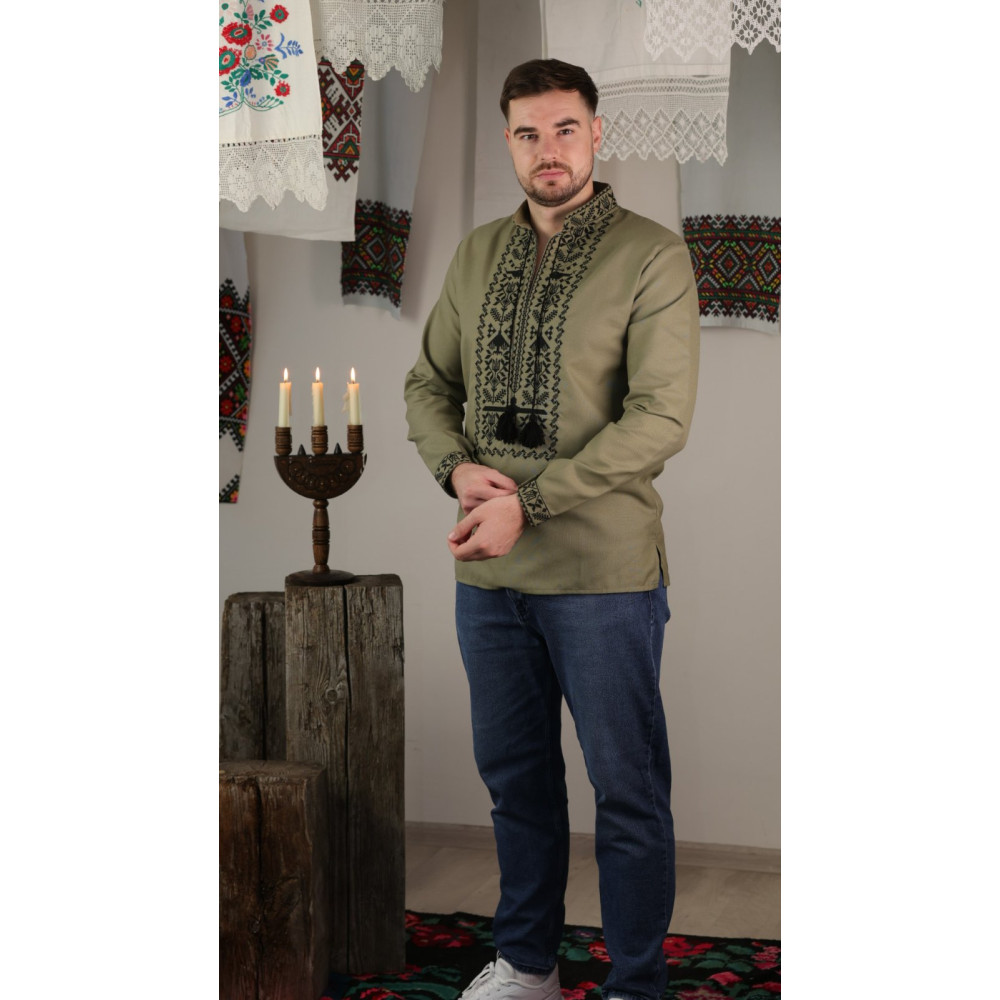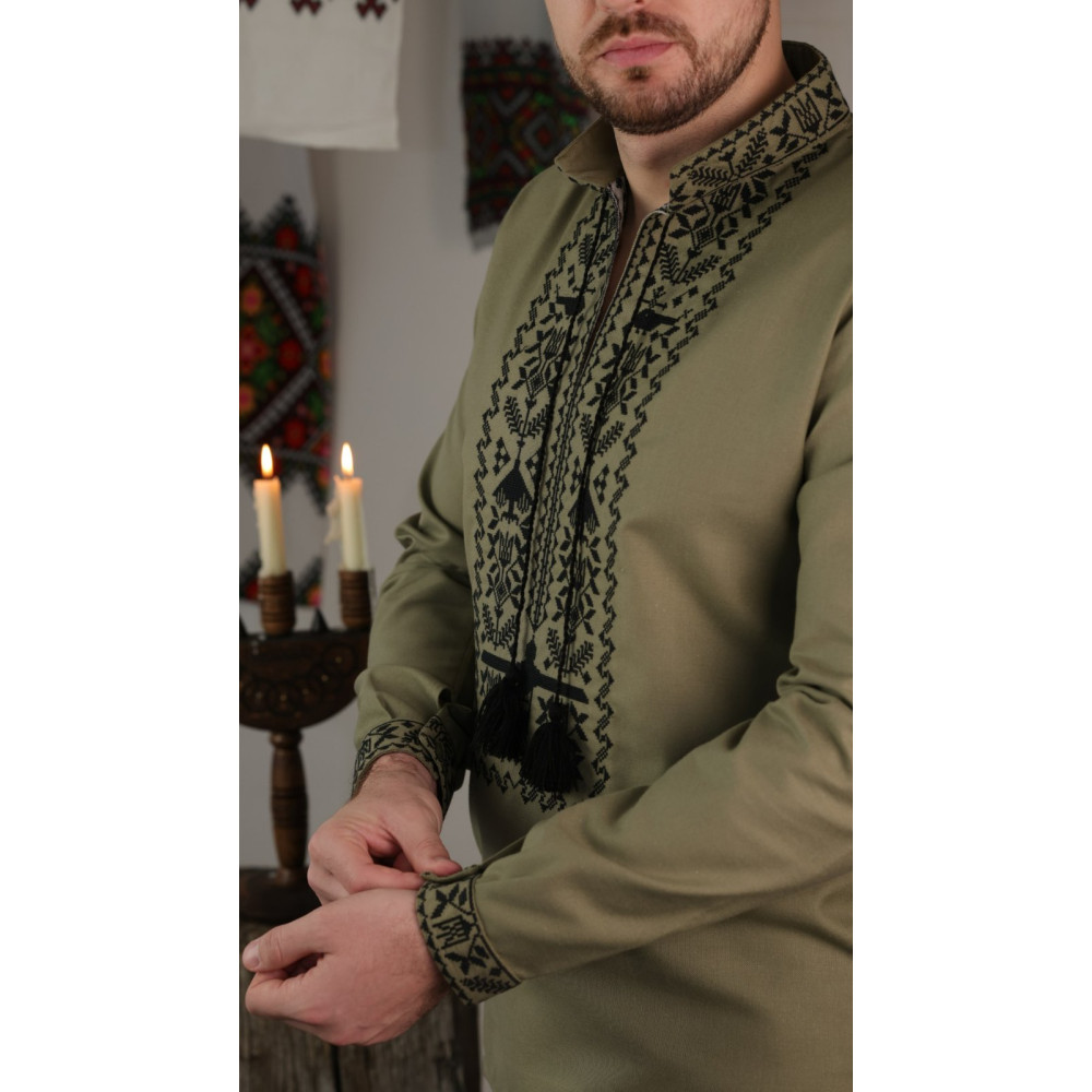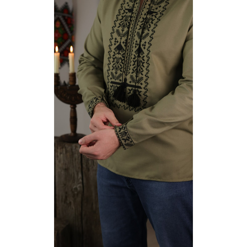 Представляємо мужню та сучасну чоловічу вишиванку у стилі, що поєднує українську етніку з трендовими відтінками. Основний колір — глибокий хакі (оливковий/пісочний) — символізує стійкість, зв'язок із природою та непохитність. Контрастна чорна вишивка надає виробу графічності та виразності, створюючи сильний і благородний образ.