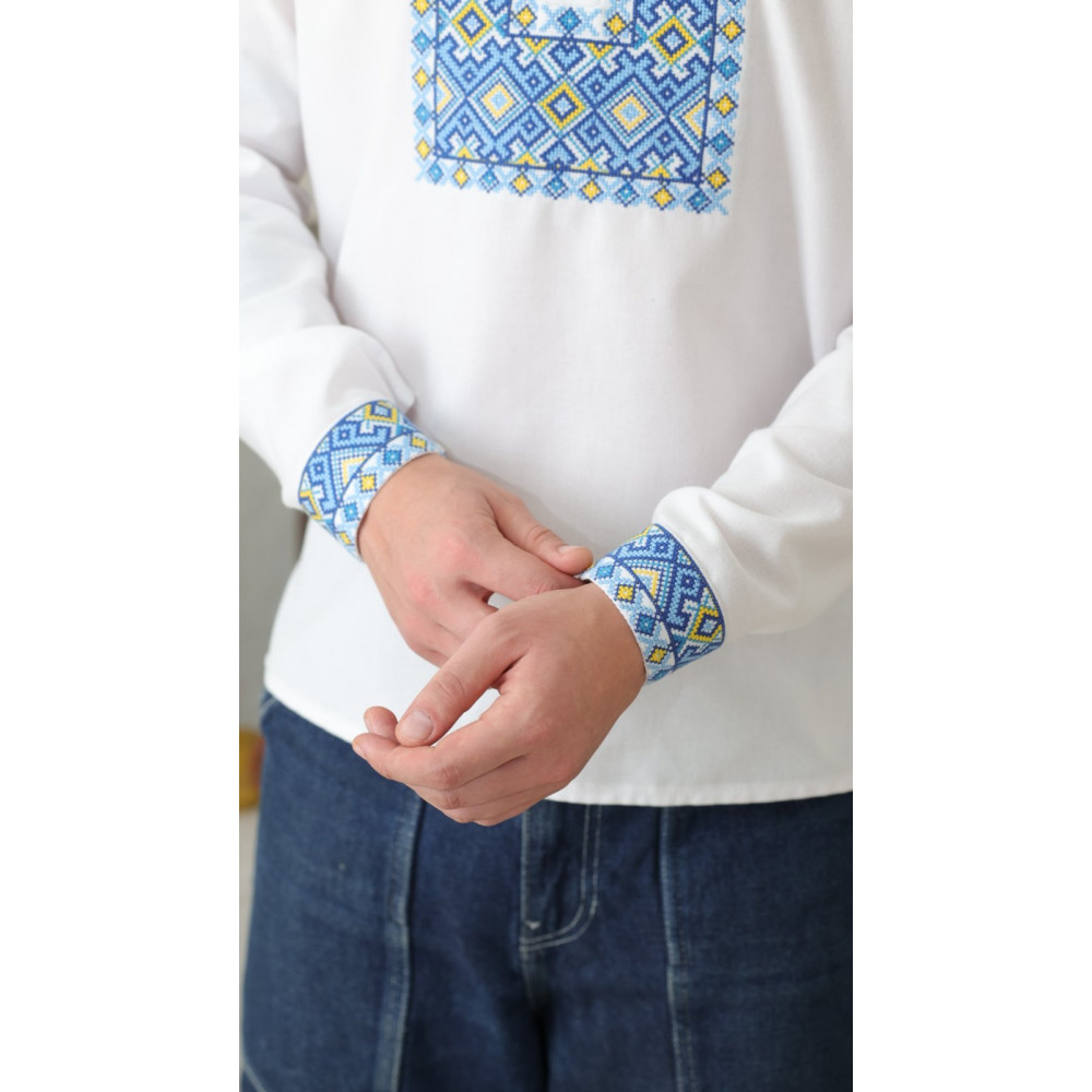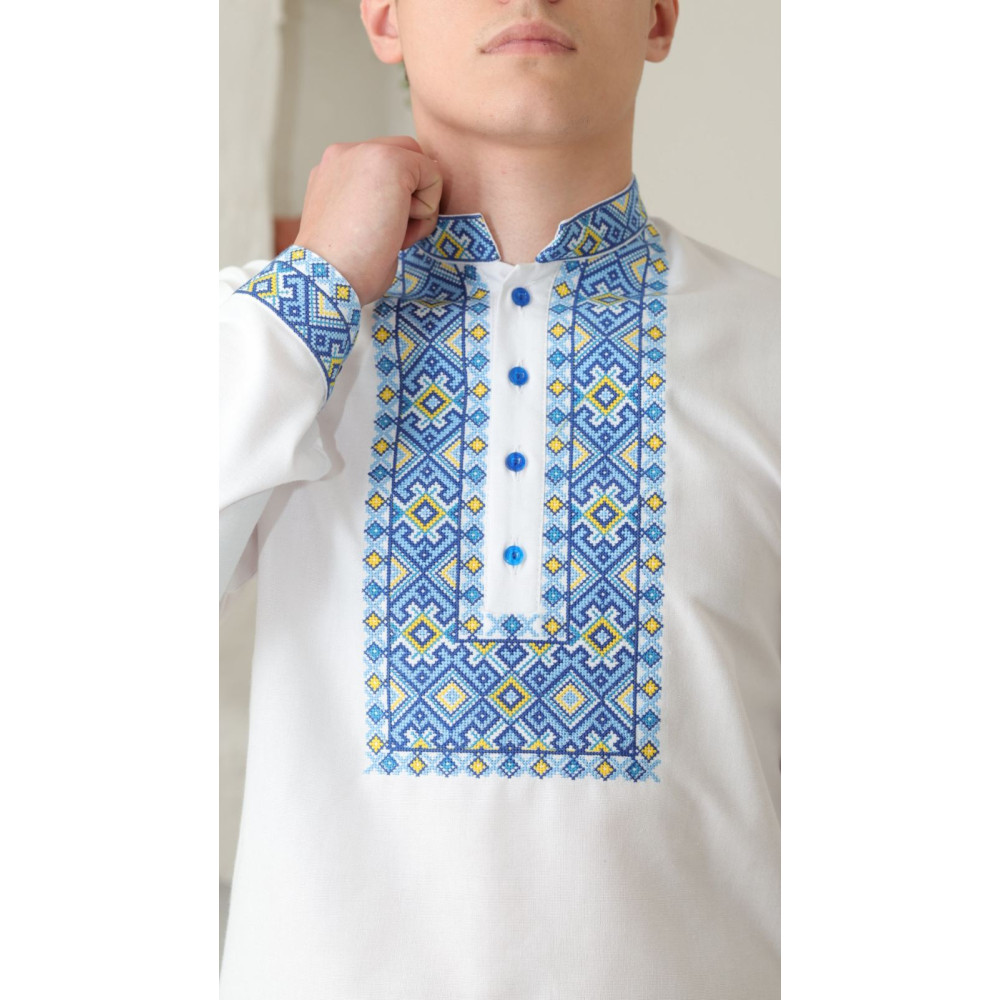 Яскравий контраст білого полотна та насиченої вишивки. Поєднання синього (символ неба, миру, сили) та жовтого/золотистого (символ сонця, добробуту, радості) створює життєствердний, патріотичний образ.
