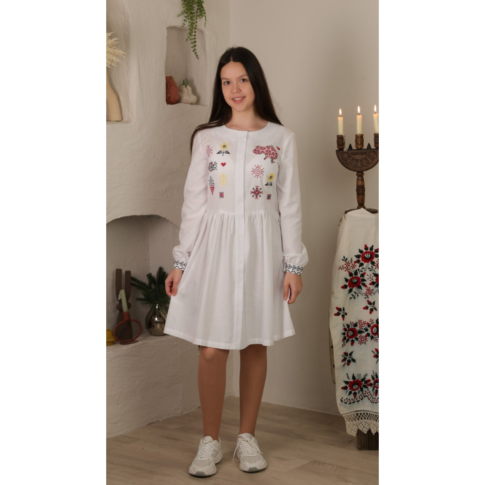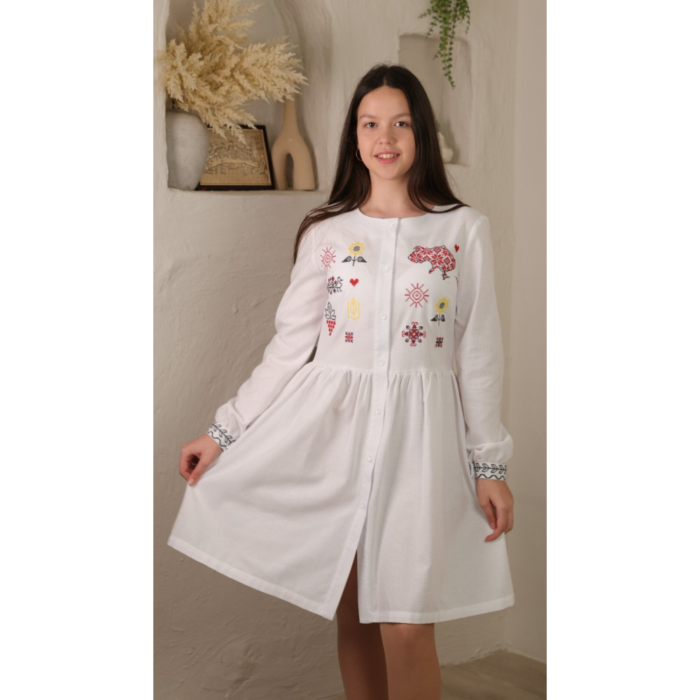Стильна та сучасна сукня-вишиванка для дівчаток і підлітків, яка поєднує ніжність традиційного крою з актуальними патріотичними символами. Ідеальний вибір для школи, святкових подій, патріотичних заходів та повсякденного носіння.