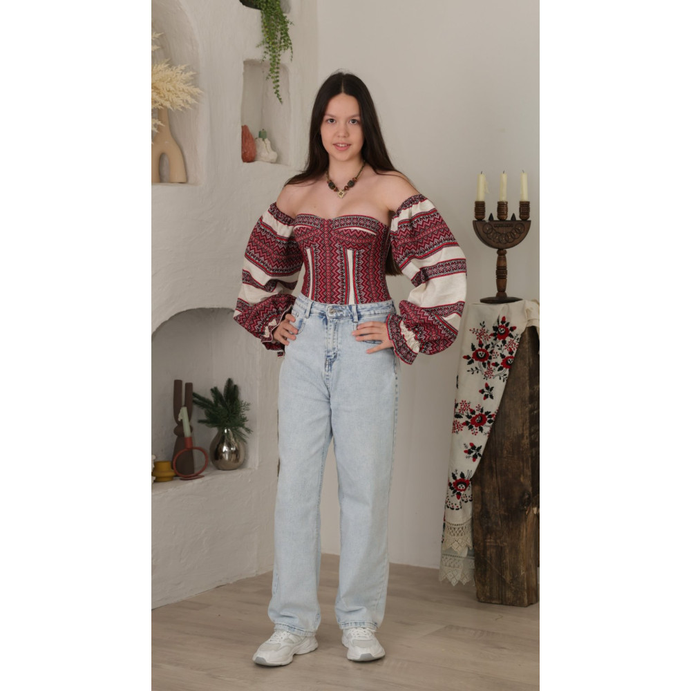 Вишивка: Насичений, геометричний орнамент у відтінках червоного, бордового та білого кольорів. Вишивка розташована як на основній частині (корсеті), так і на пишних рукавах.