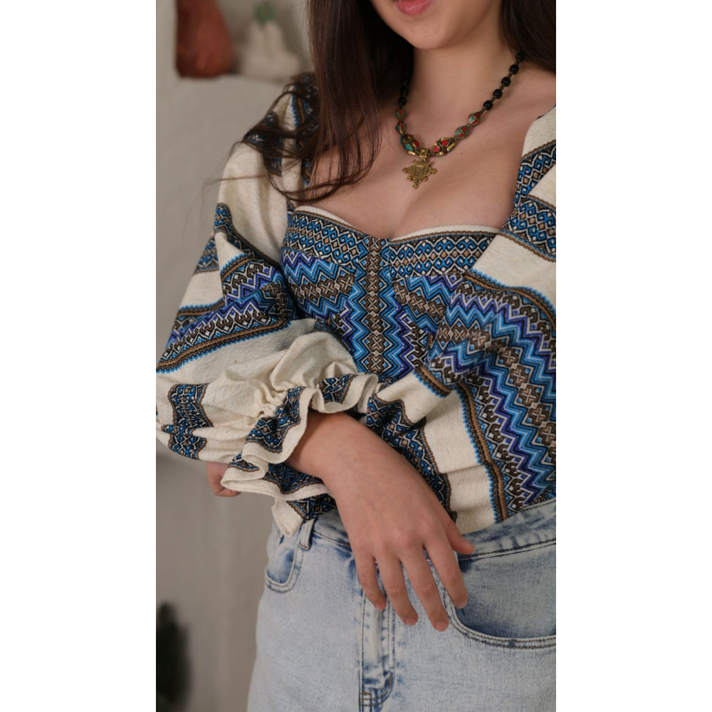 Вишивка: Насичений, геометричний орнамент у синьому кольорі. Вишивка розташована як на основній частині (корсеті), так і на пишних рукавах.