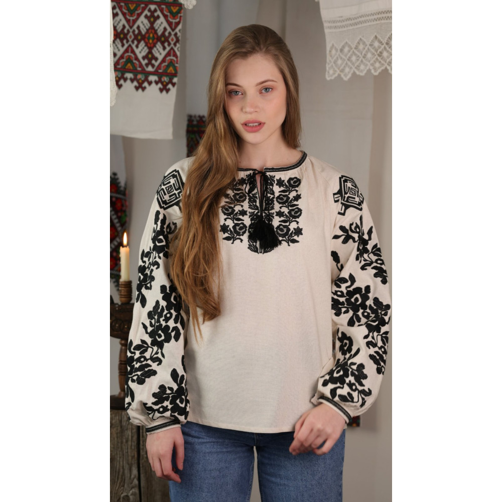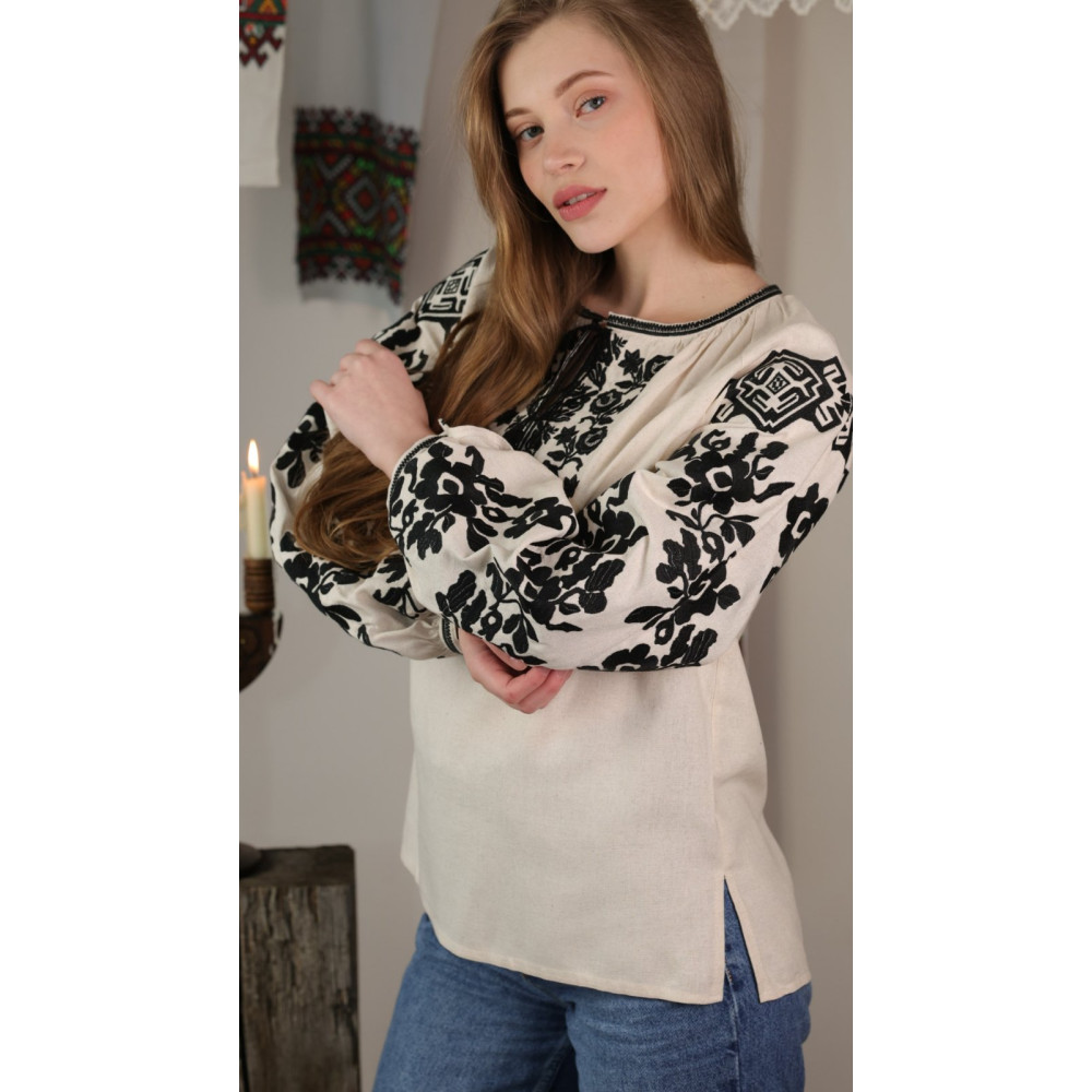Модель виконана у стильному монохромі, де велика чорна квіткова вишивка ефектно виділяється на фоні натуральної світло-бежевої (лляної) тканини. Це ідеальний вибір для створення як повсякденного, так і святкового образу.