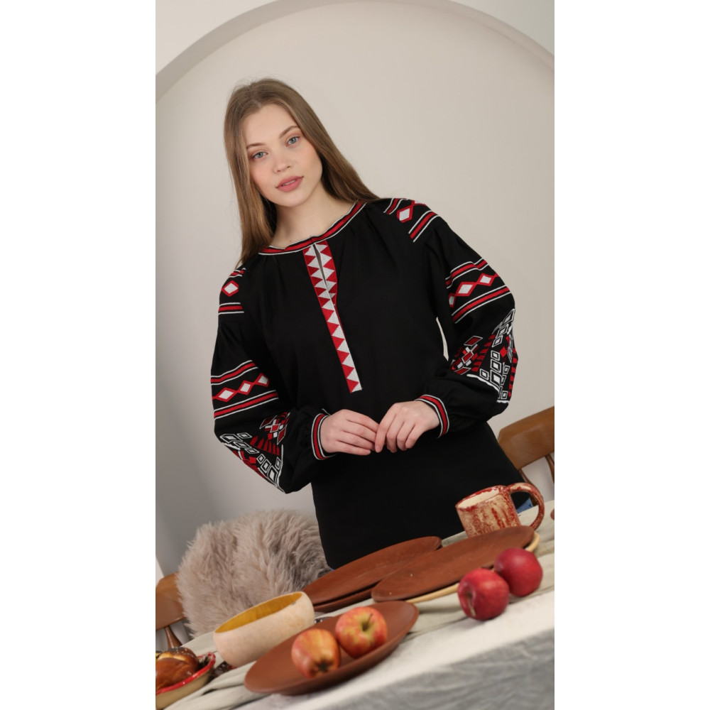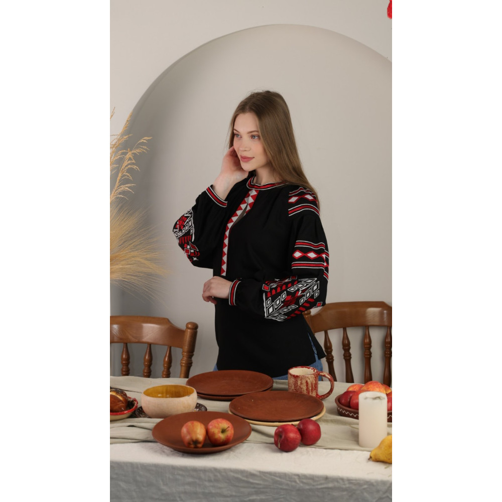 Ця вишиванка чудово поєднується з класичними джинсами для образу у стилі кежуал, а також з діловими брюками або спідницею-олівець для офісного або святкового вбрання. Червоно-чорна гамма є символічною та завжди привертає увагу.