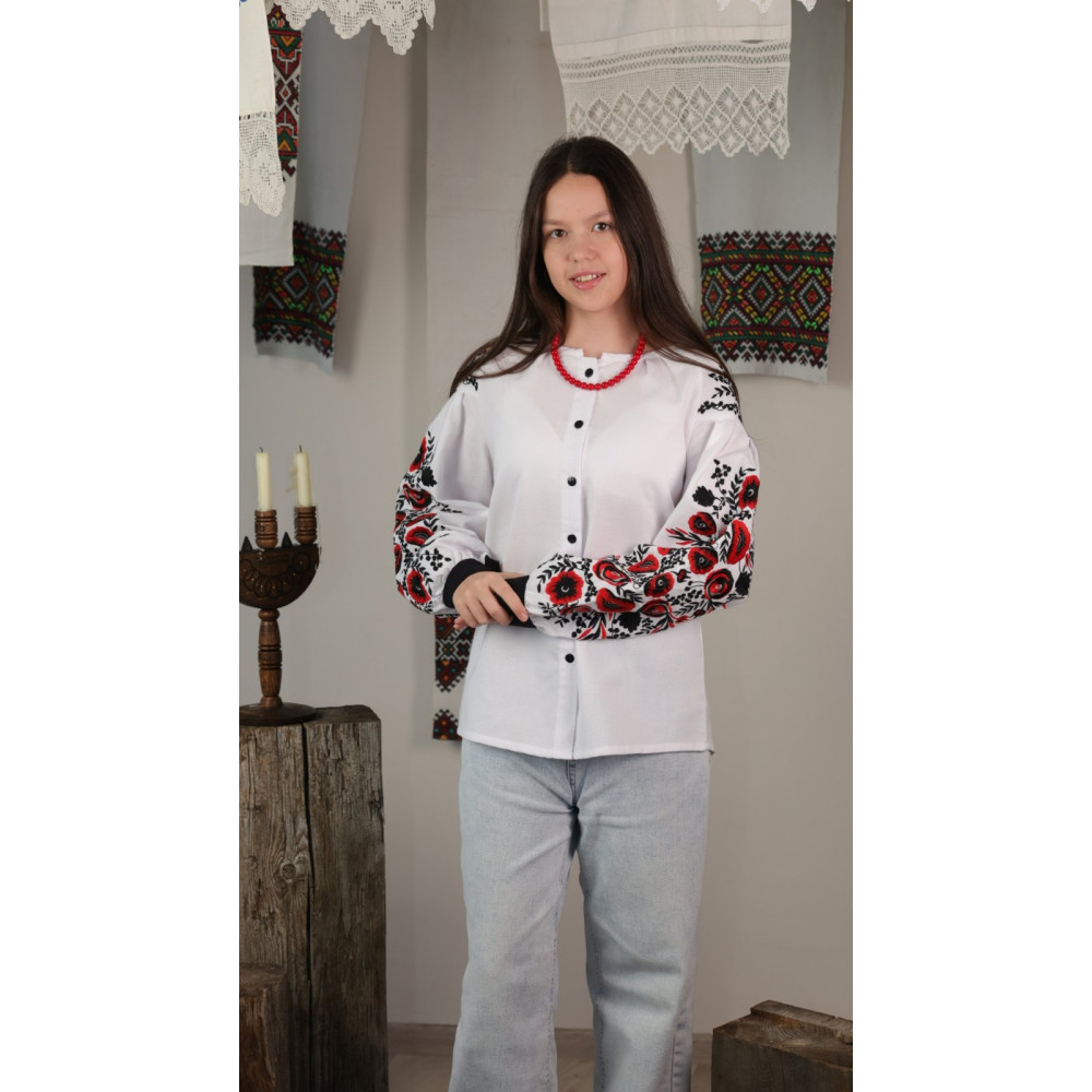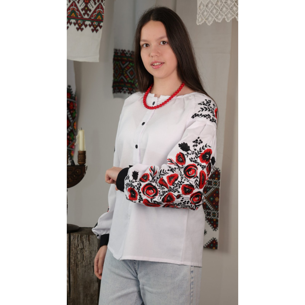 Контрастні деталі: Чорні ґудзики на центральній планці та широкі чорні манжети створюють яскравий, графічний контраст з білою тканиною та червоними маками, роблячи модель дуже сучасною.