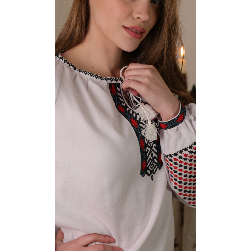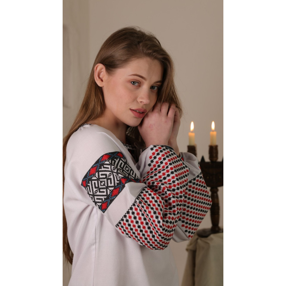 Ця вишиванка поєднує класичну білосніжну основу з насиченим, ритмічним орнаментом, що створює свіжий і сучасний образ. Ідеальний вибір для тих, хто цінує етніку у яскравому виконанні.