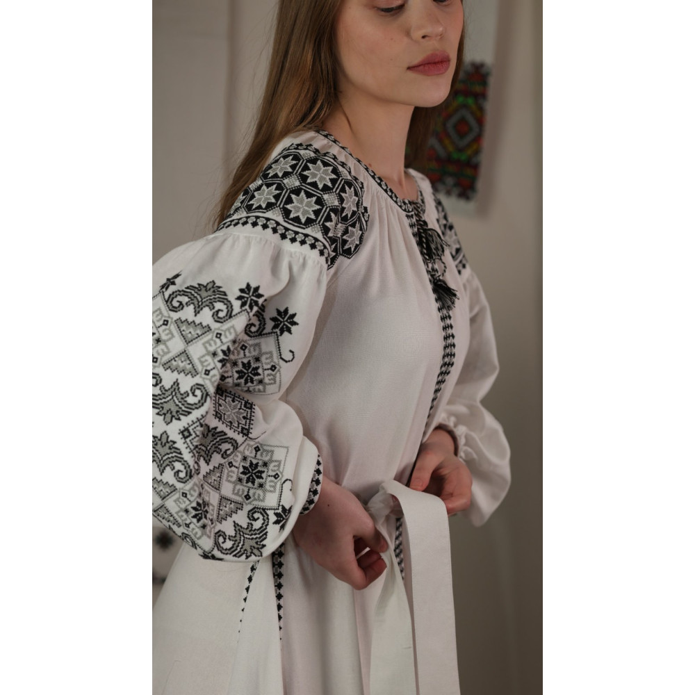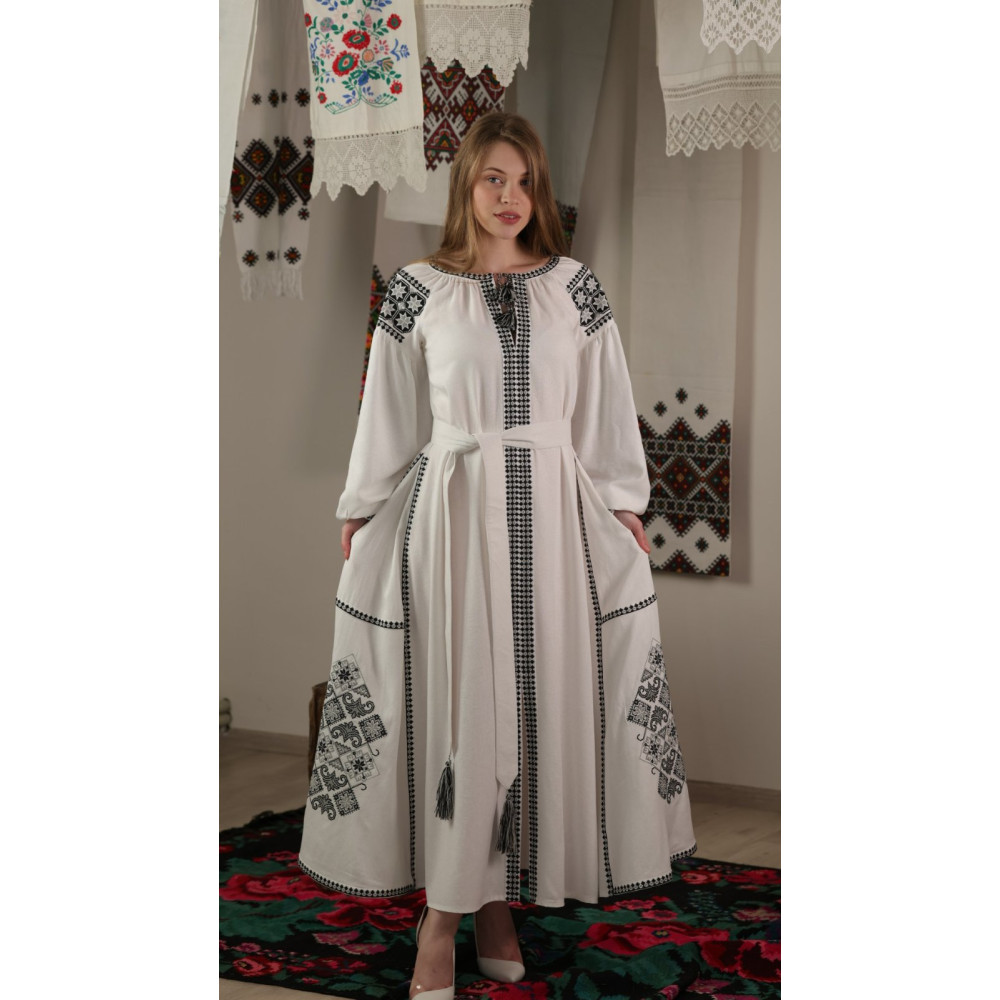 Ця розкішна сукня довжини максі виконана у чистому білому кольорі та декорована вишуканою чорною вишивкою, що створює неповторний, глибокий контраст.