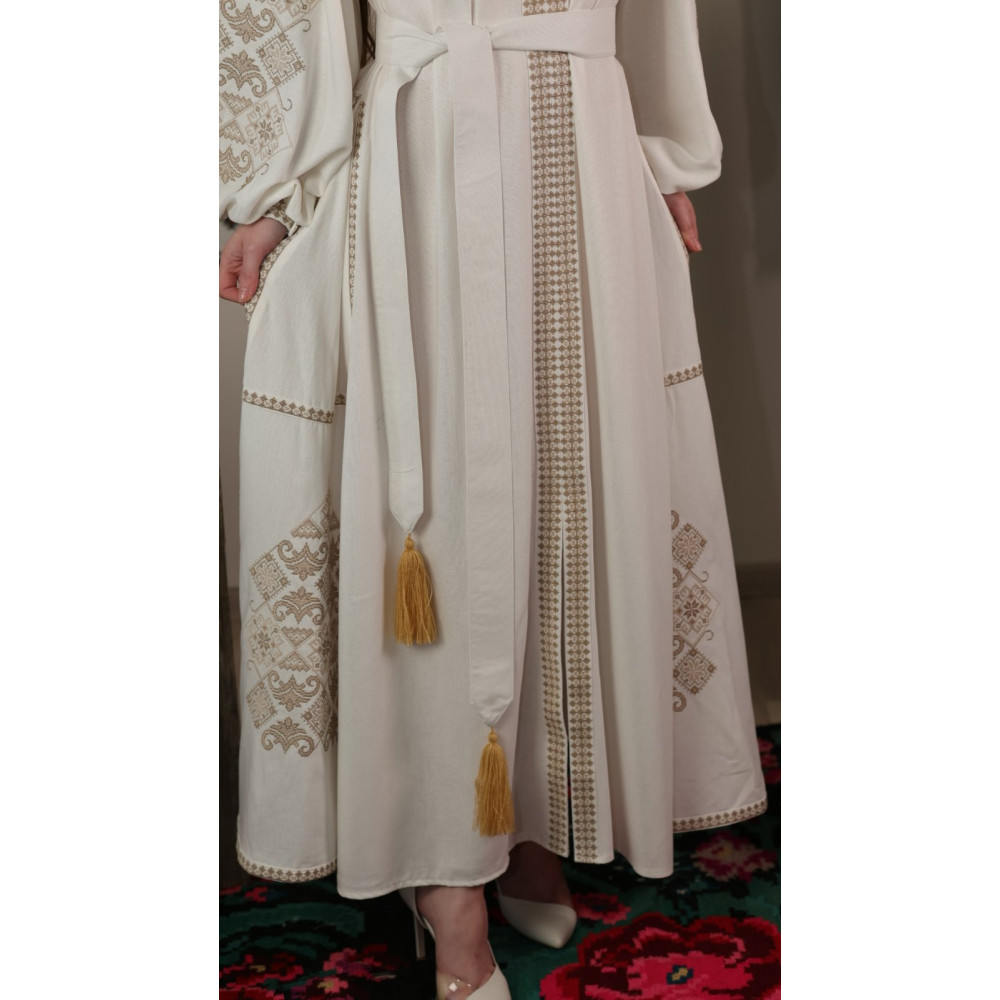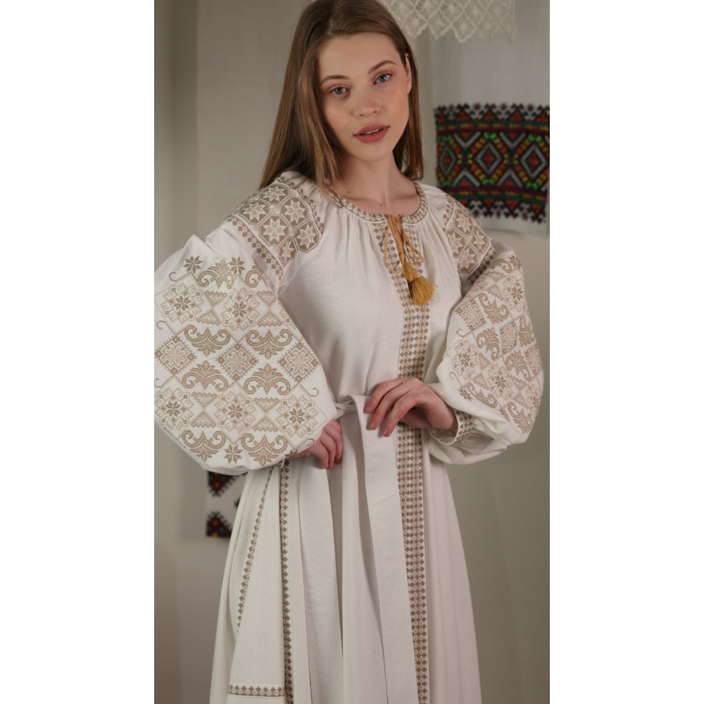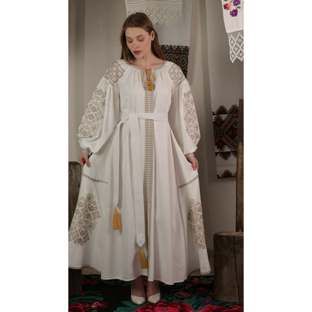 Сукня-вишиванка ЖП 75 – це втілення ніжності, світла та багатого українського врожаю. Розкішна сукня довжини максі виконана у чистому білому кольорі та прикрашена вишуканою пісочно-золотистою вишивкою. Цей монохромний дизайн нагадує про золоті колоски на білому полі та ідеально підходить для весіль, вінчань, хрестин та інших світлих свят.